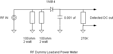Here's a simple but useful accessory for QRP operation: a dummy load - power meter. It presents a good 50-ohm 4-watt load for a transmitter while the rf detector circuit will let you measure the power into it. A regular VOM can be used to measure the dc voltage produced by the detector. I used a 1N914 diode and two 100-ohm 2-watt resistors in parallel for the 50 ohm load. Measure the detected voltage, add about 0.5 volt for diode drop, square that voltage, and divide by 100. The answer is the power into the load in watts. One watt corresponds to about 9.5 volts dc. Now you'll know whether that rig puts out one watt or two. The dummy load - power meter is fine for measuring powers above a watt or so but kind of inaccurate below 50 mw.